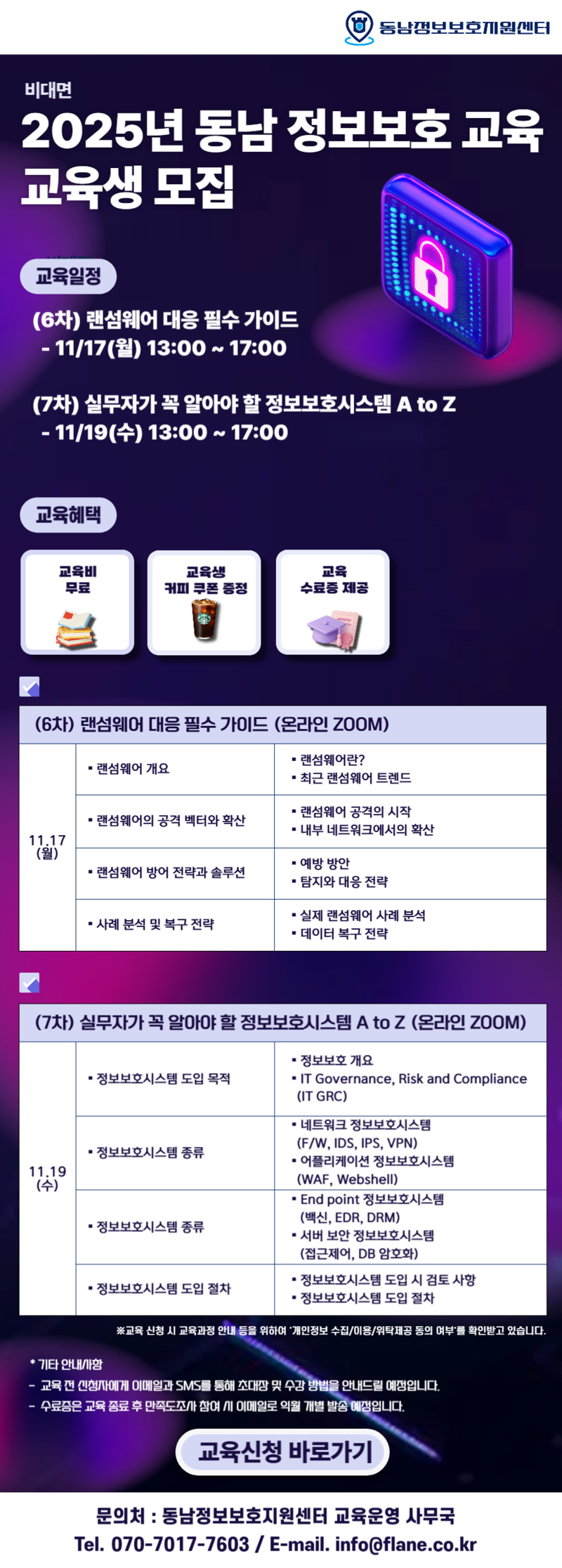 | 제목 | [교육생모집] 2025년 동남 정보보호 교육, 교육생 모집 6~7차 (비대면) | ||||